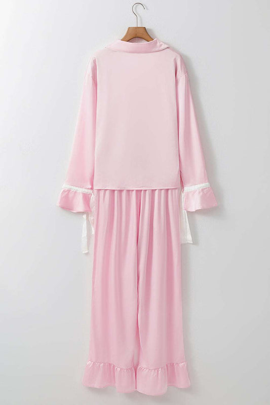 Light Pink Satin Knot Accent Shirt and Ruffled Pants Lounge Set